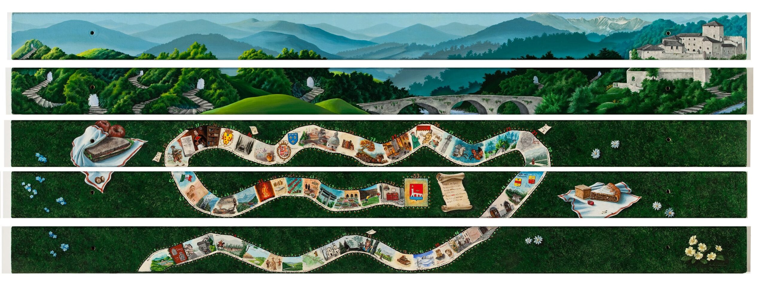 The bench is currently located on Via del Piagnaro, which leads from the town center to the Piagnaro Castle, and can be used by everyone as a traditional game of the goose.