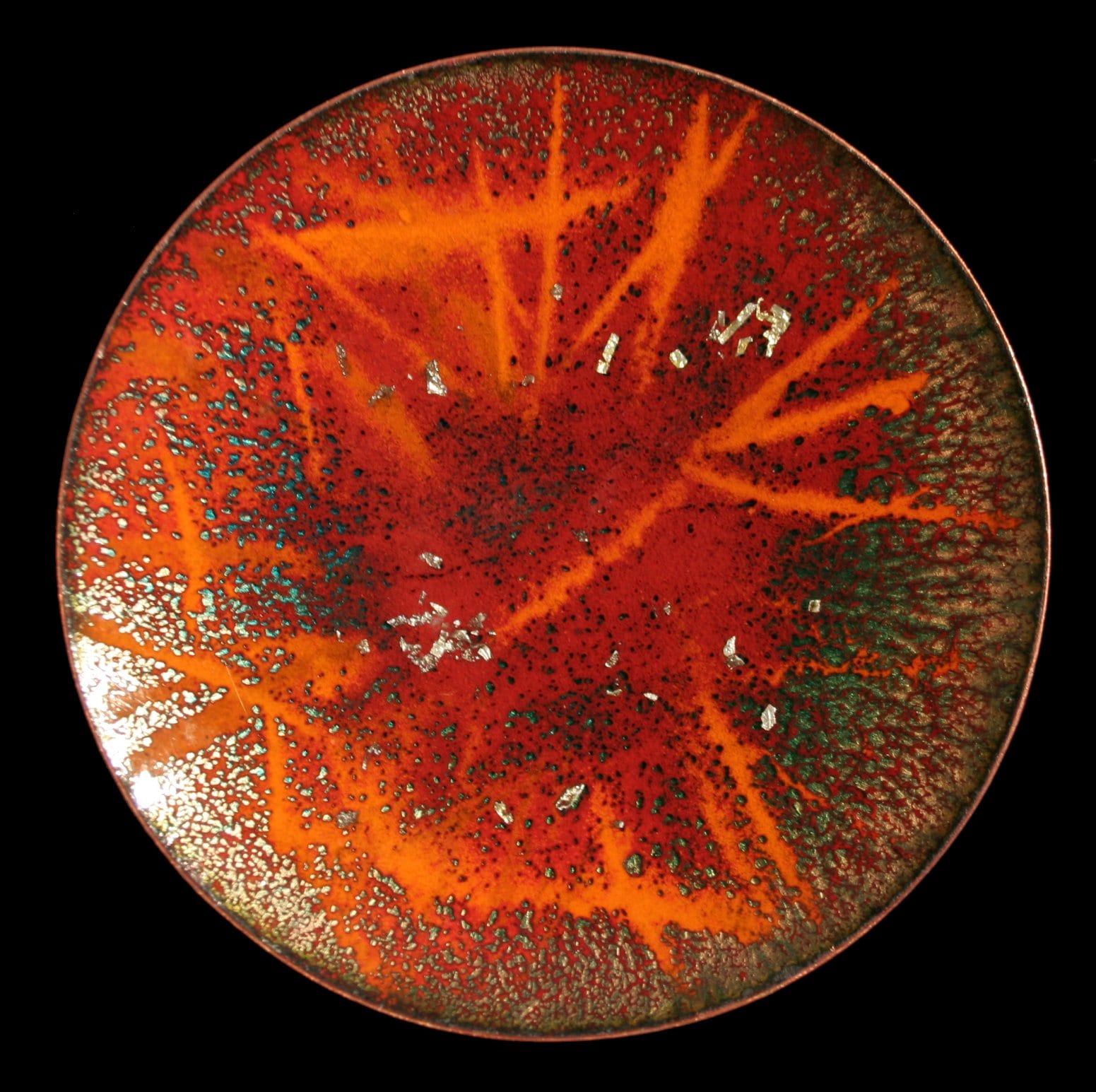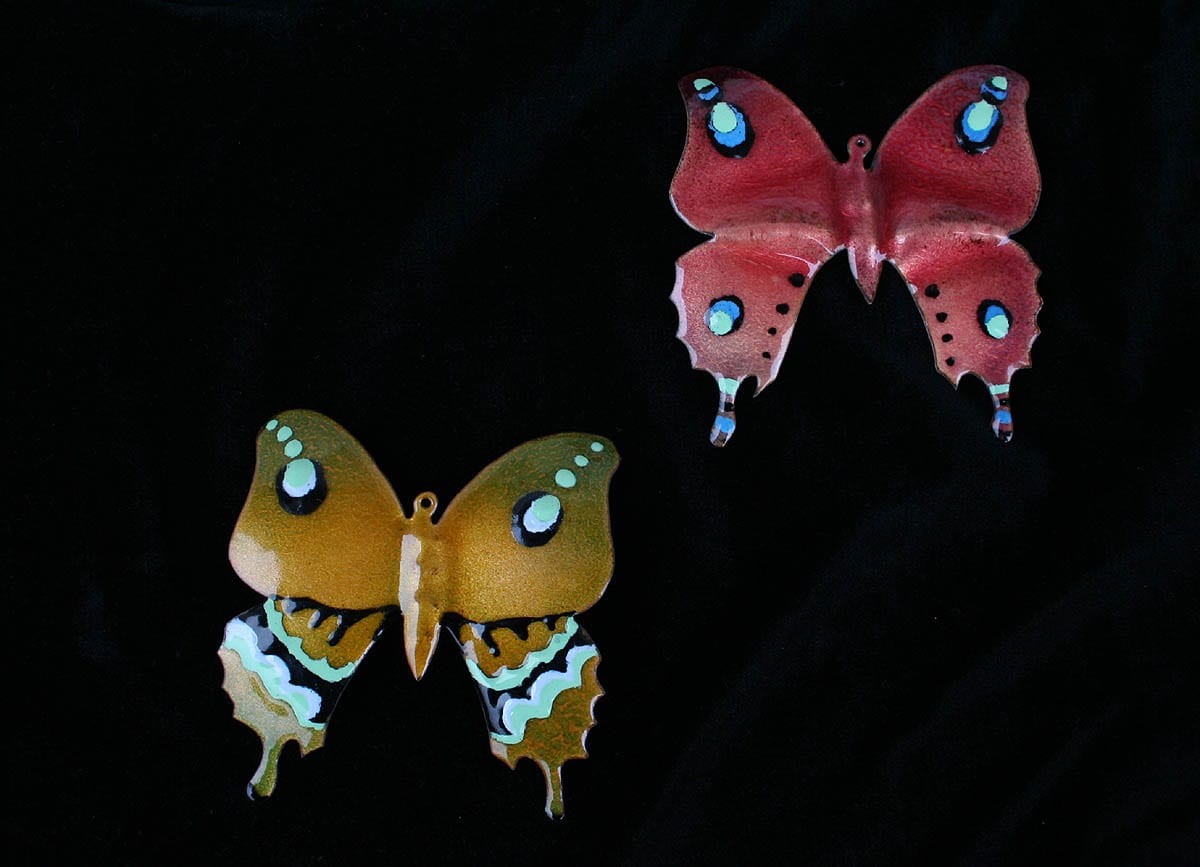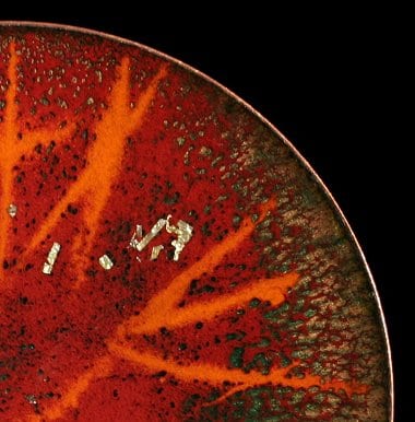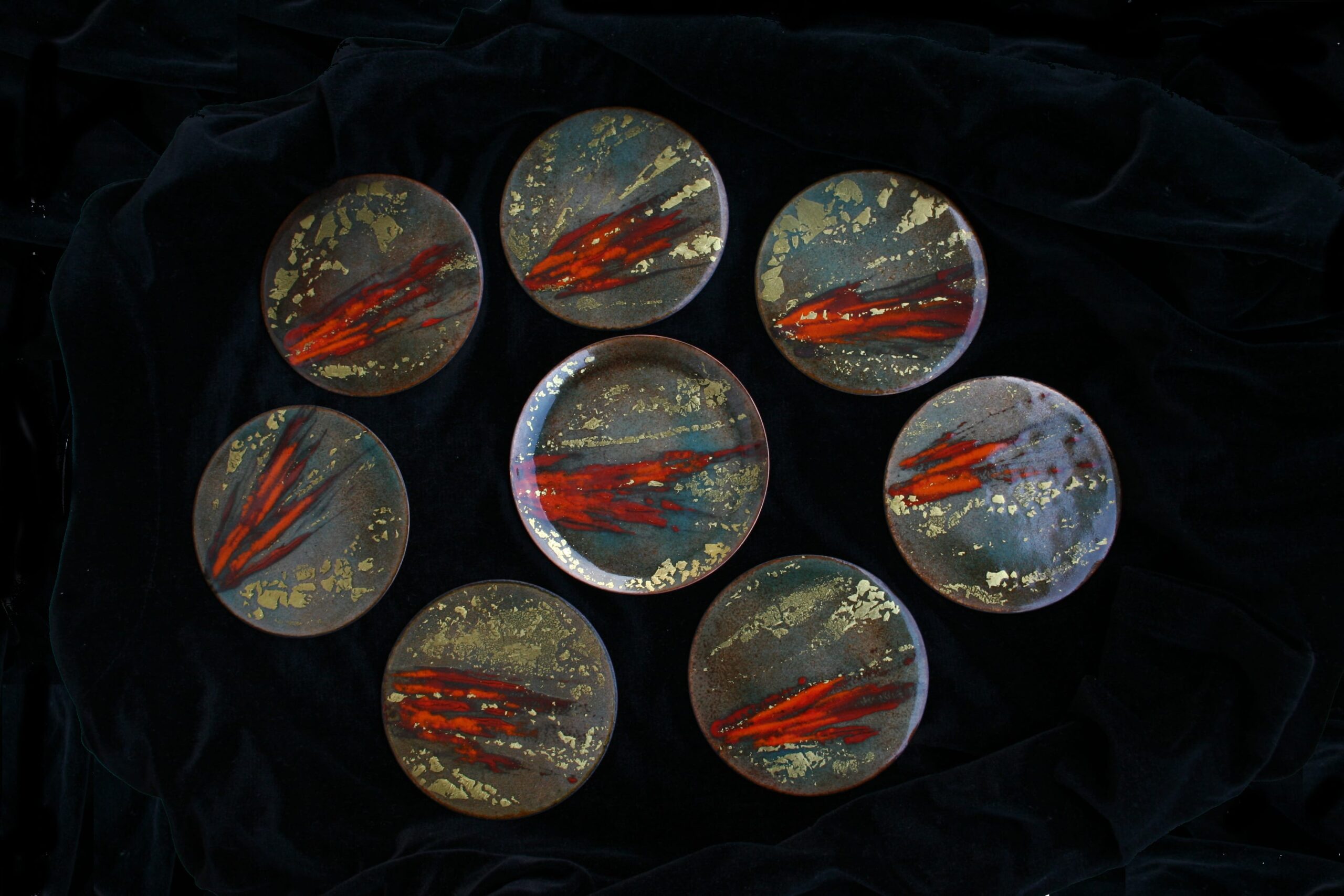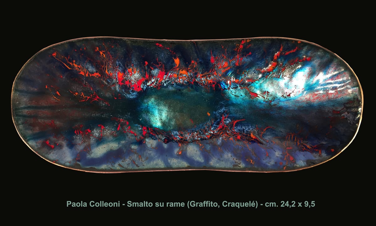 With complex techniques of oxides powder application and heats up to 1700 °F, the fire melts the glass, melting its light and its colours, the silver and the gold with the copper substrate, making each piece a unique artwork.