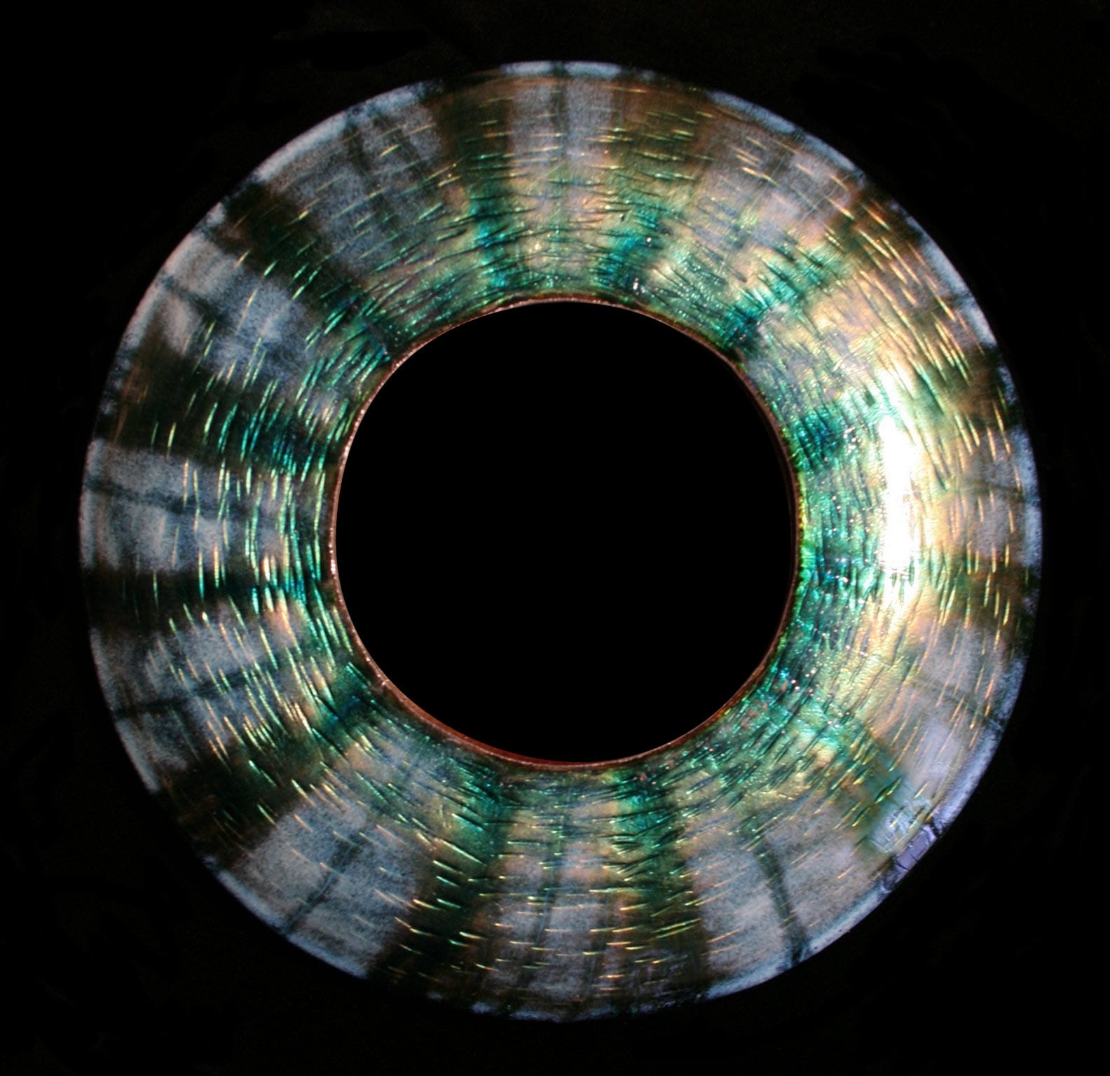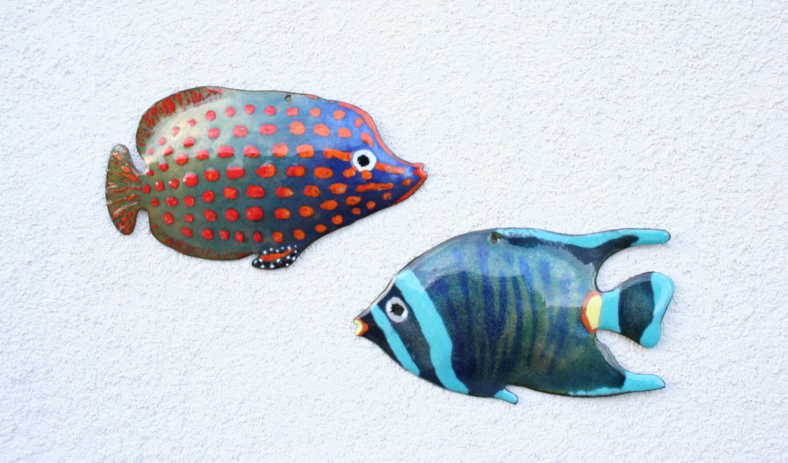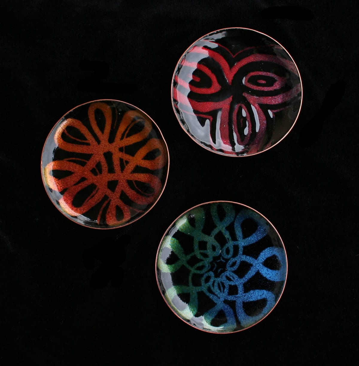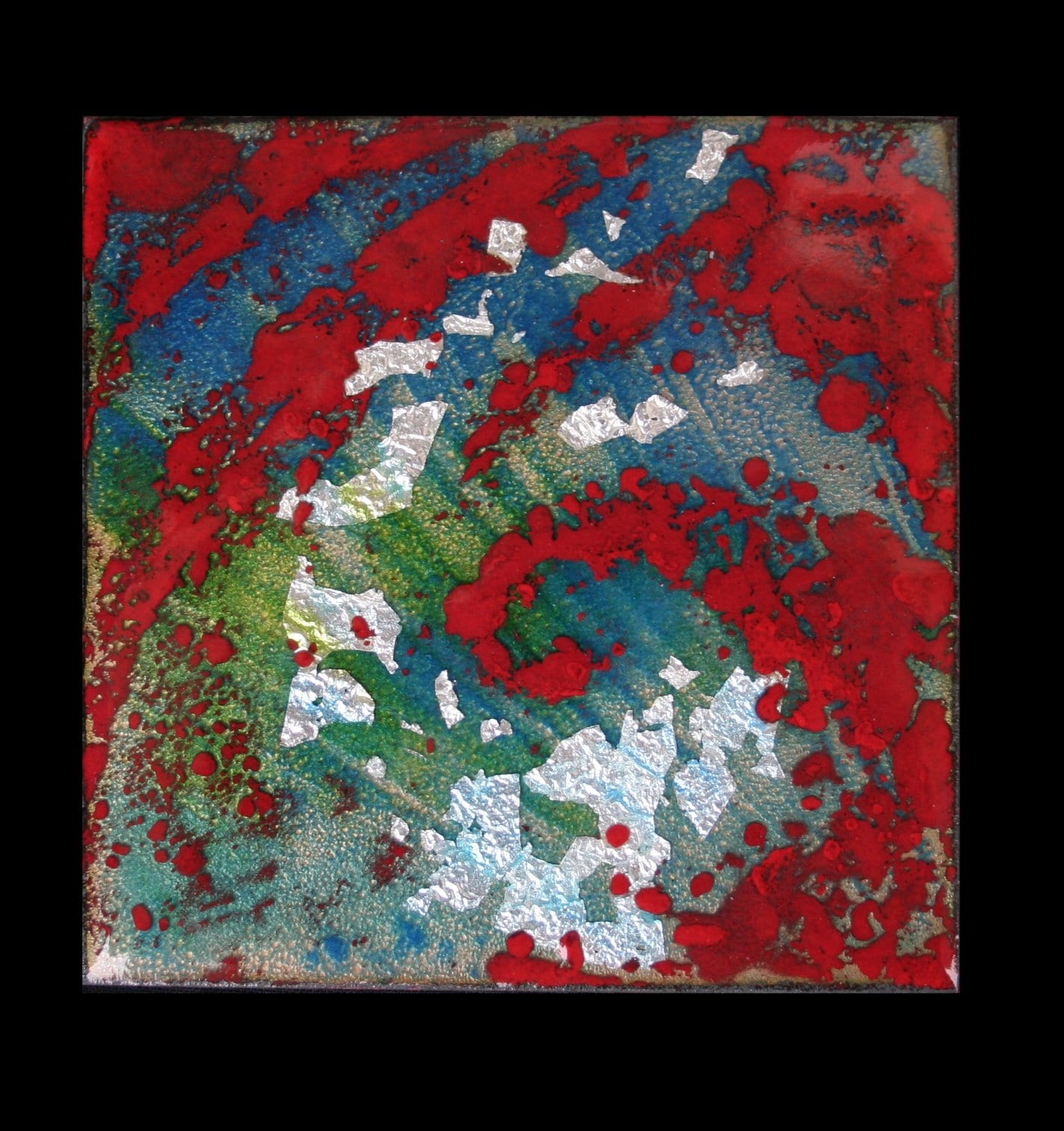 With complex techniques of oxides powder application and heats up to 1700 °F, the fire melts the glass, melting its light and its colours, the silver and the gold with the copper substrate, making each piece a unique artwork.