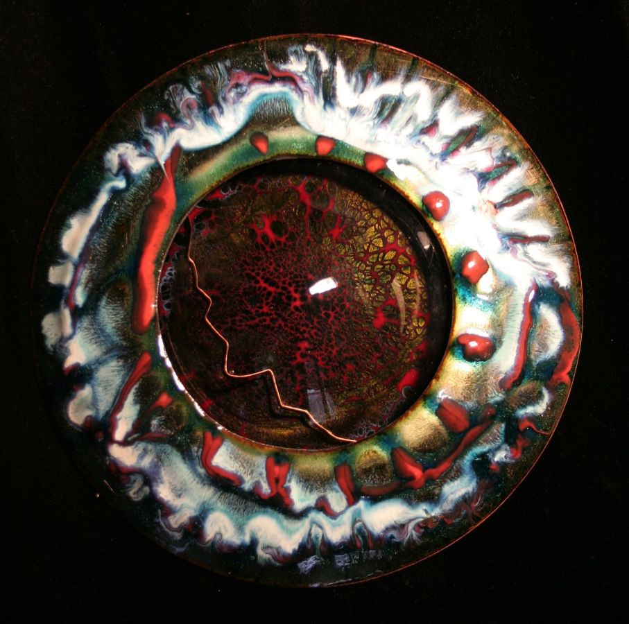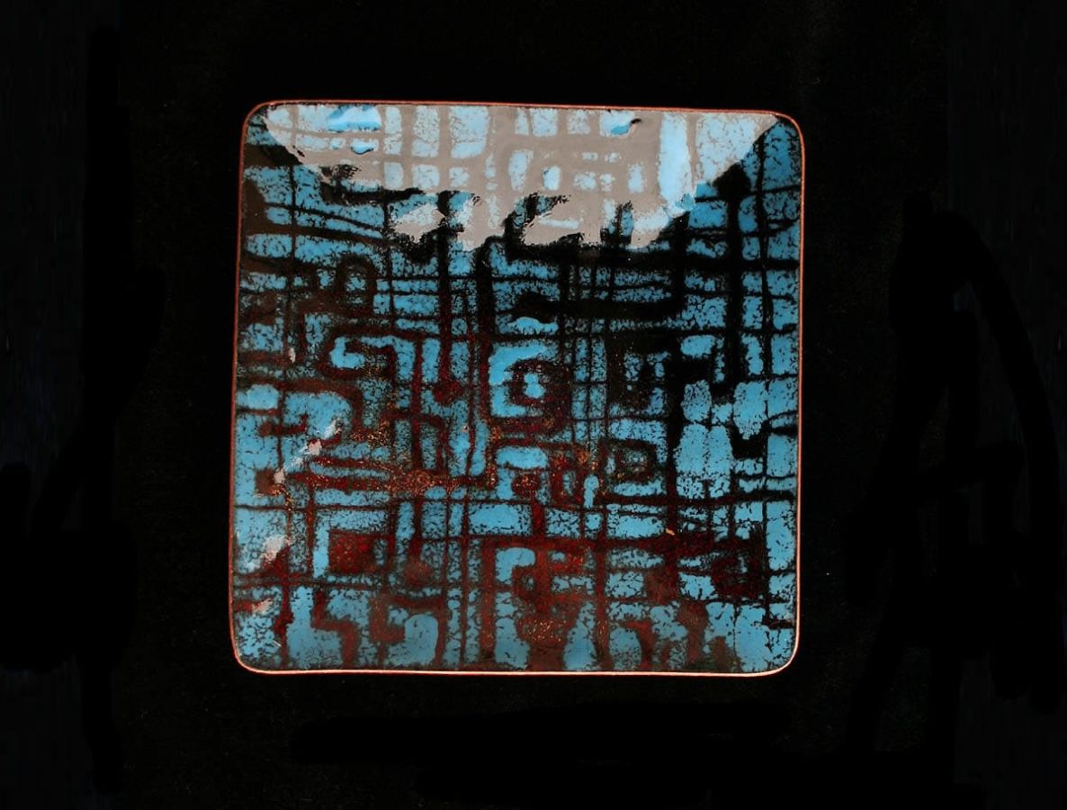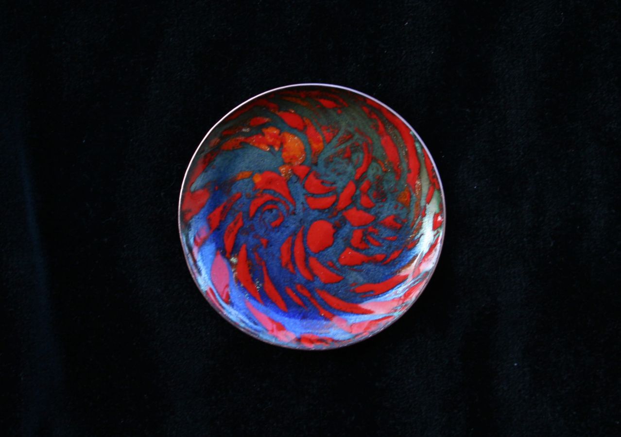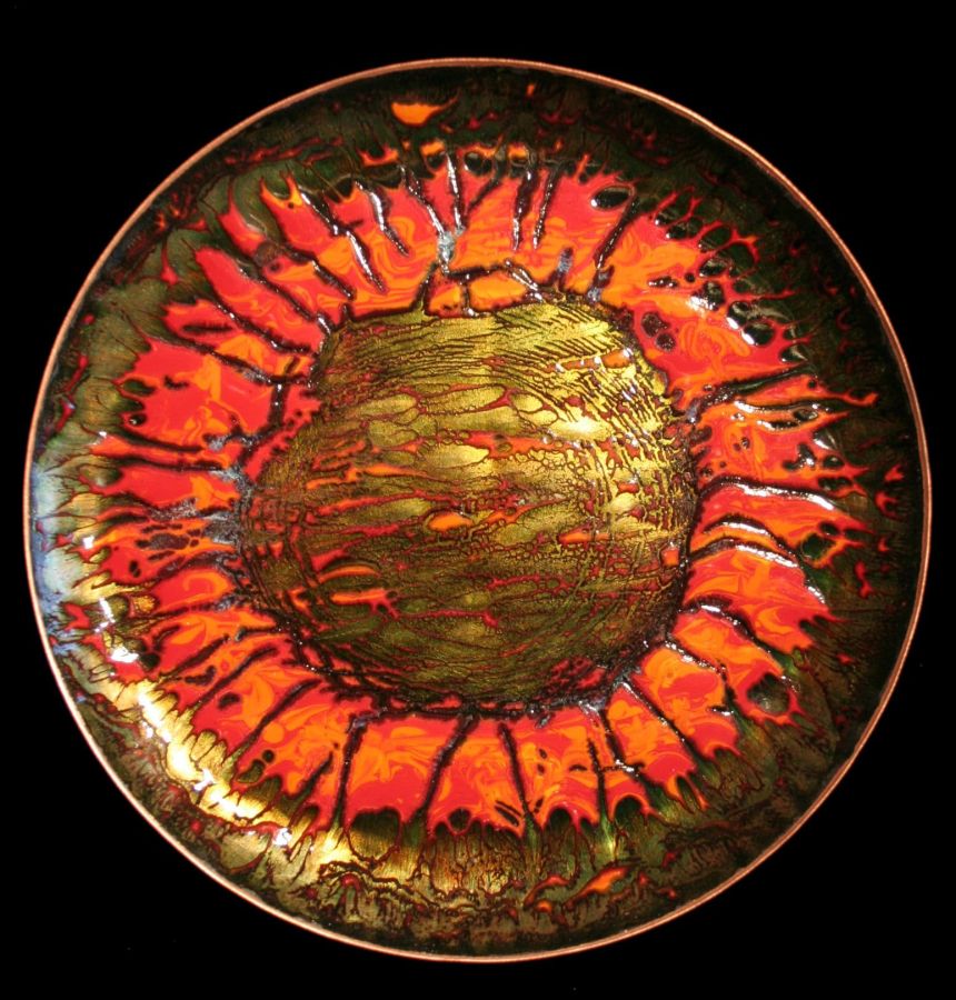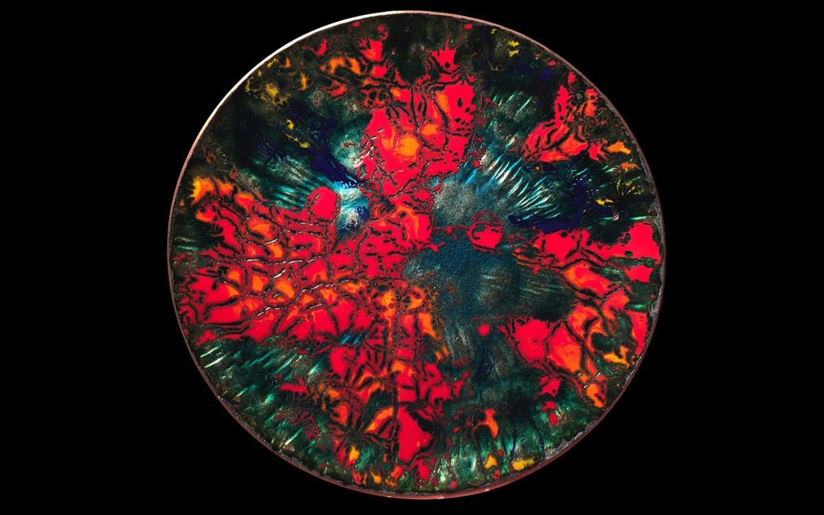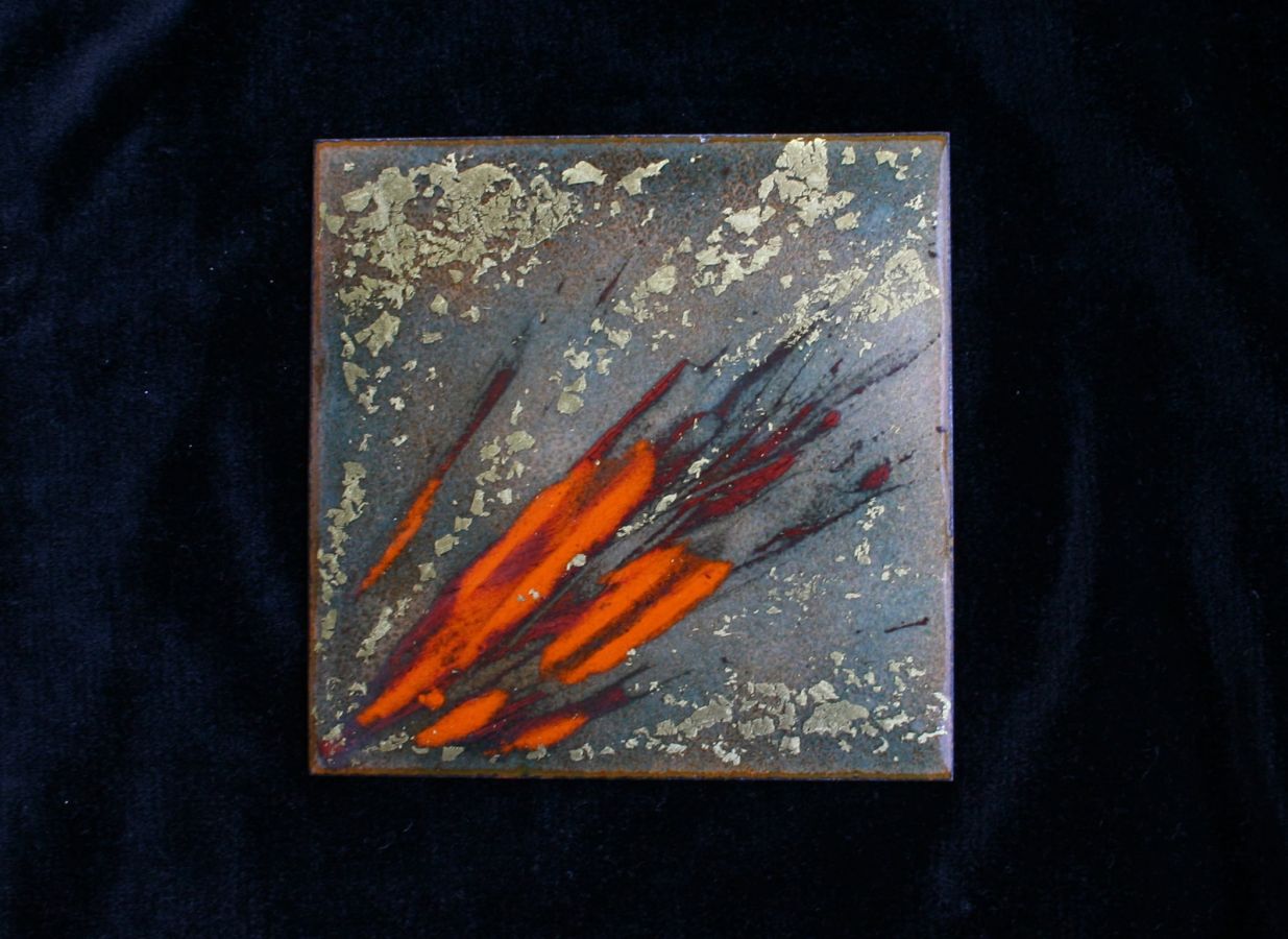 With complex techniques of oxides powder application and heats up to 1700 °F, the fire melts the glass, melting its light and its colours, the silver and the gold with the copper substrate, making each piece a unique artwork.
