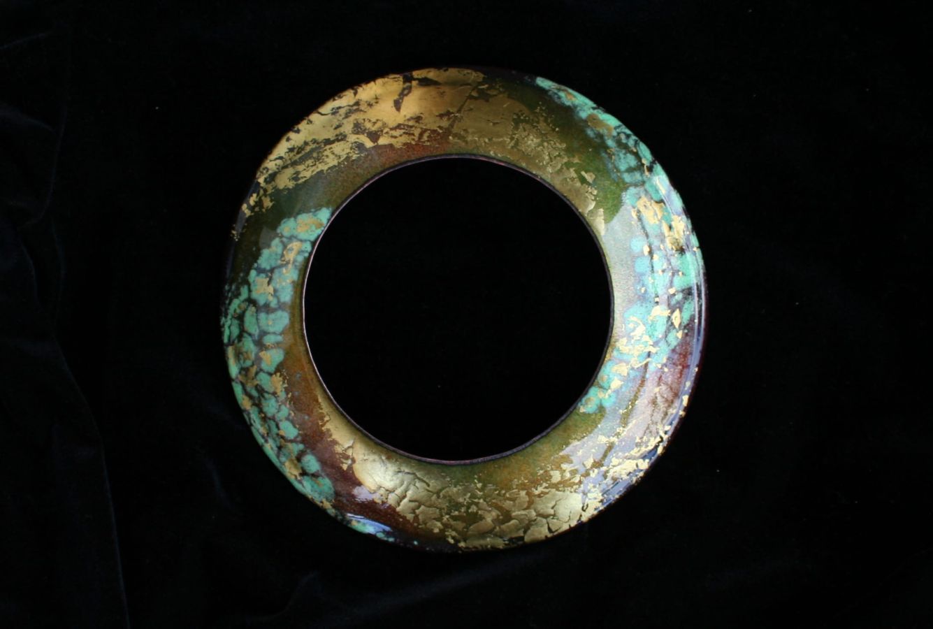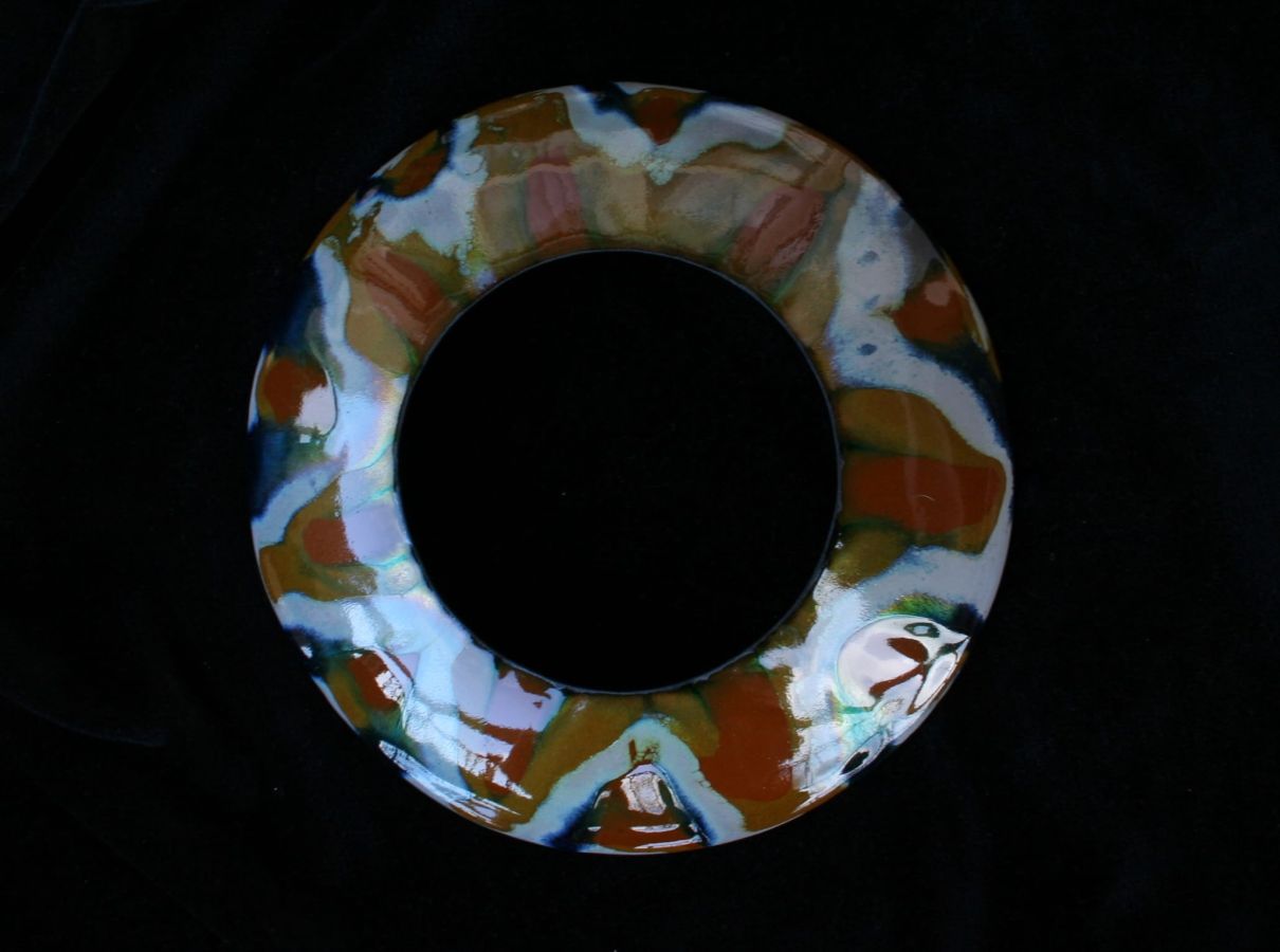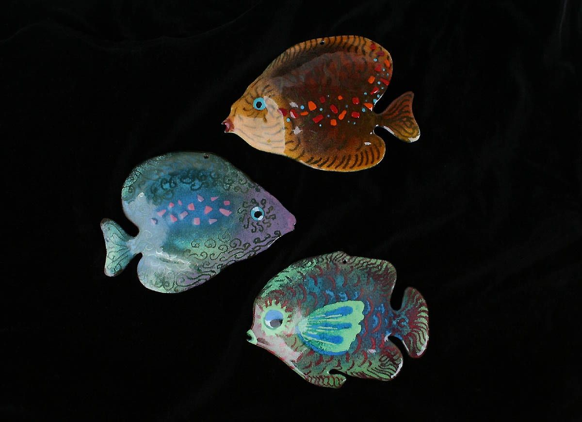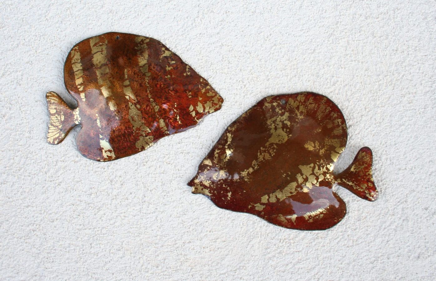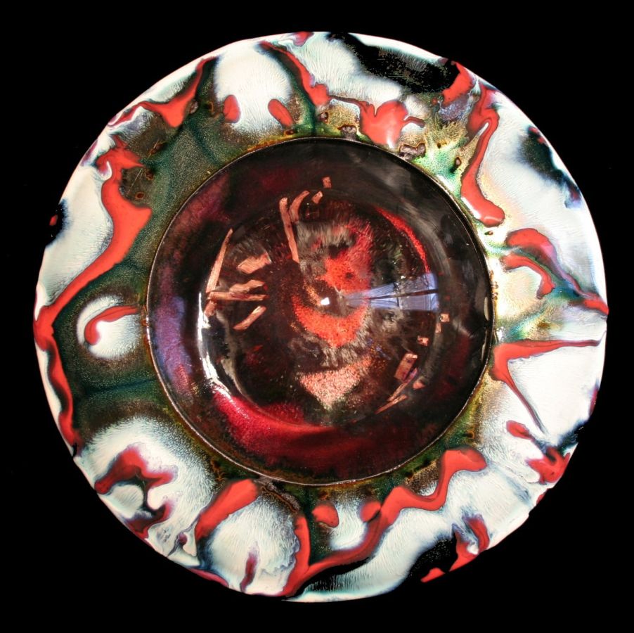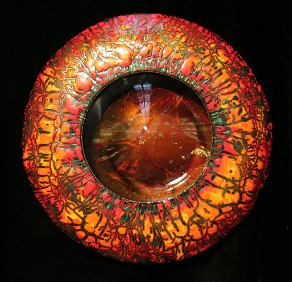 With complex techniques of oxides powder application and heats up to 1700 °F, the fire melts the glass, melting its light and its colours, the silver and the gold with the copper substrate, making each piece a unique artwork.